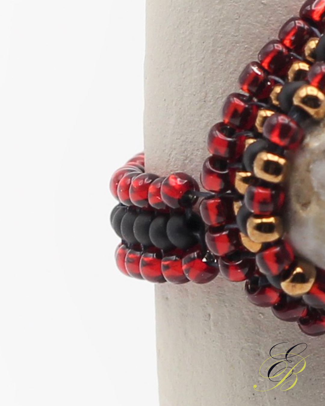 - Matériaux : galet poli, perles de rocaille 11/0 de la marque Toho, Lacy Stiff Stuff, Suédine noire, fil à tisser> Finition : anneau tisser en perles